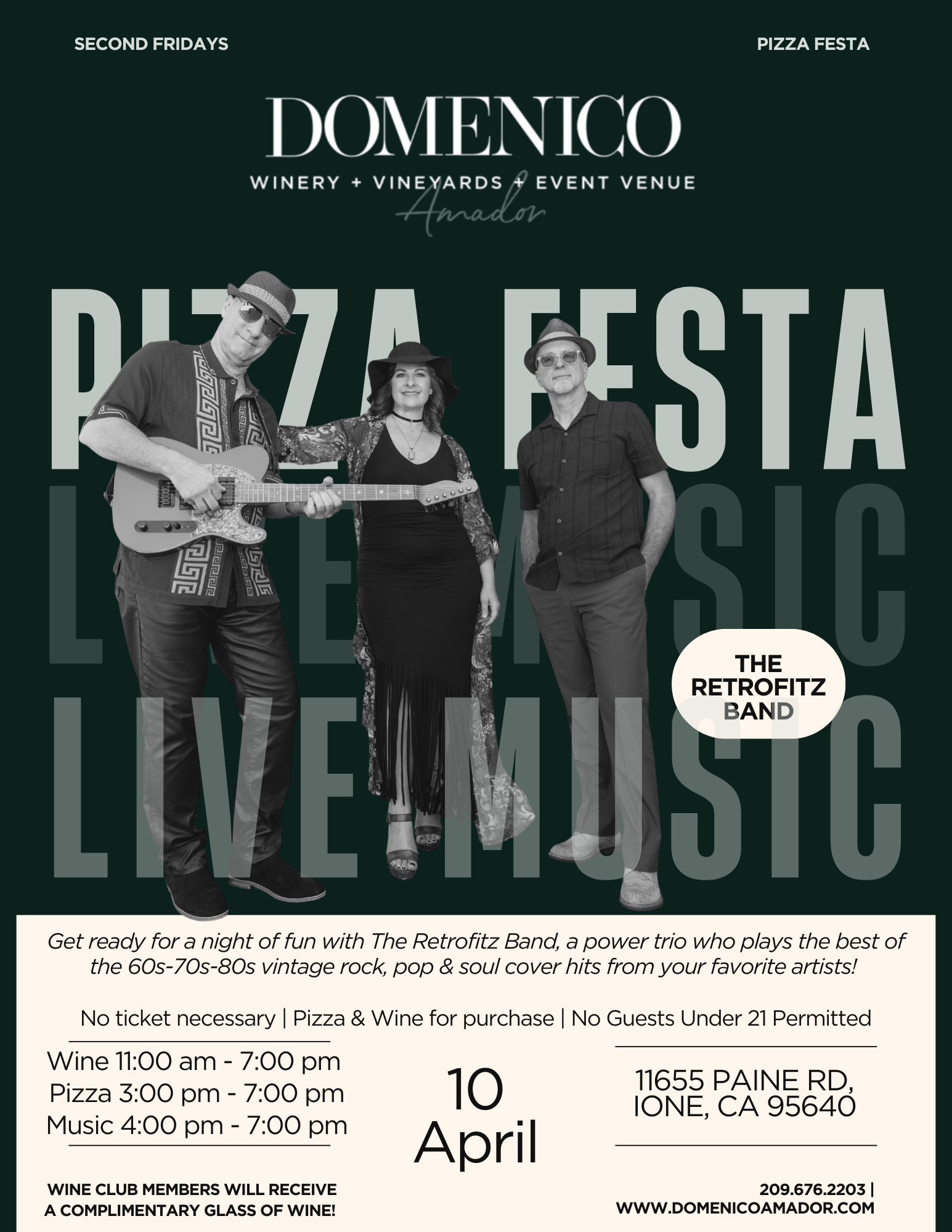Enjoy homemade pizzas in our special artisanal pizza oven handcrafted by Dominick, our owner & winemaker…and sip delicious fine wine, while listening to live music by The Retrofitz Band, a power trio who plays the best of the 60s-70s-80s vintage rock, pop & soul cover hits from your favorite artists!