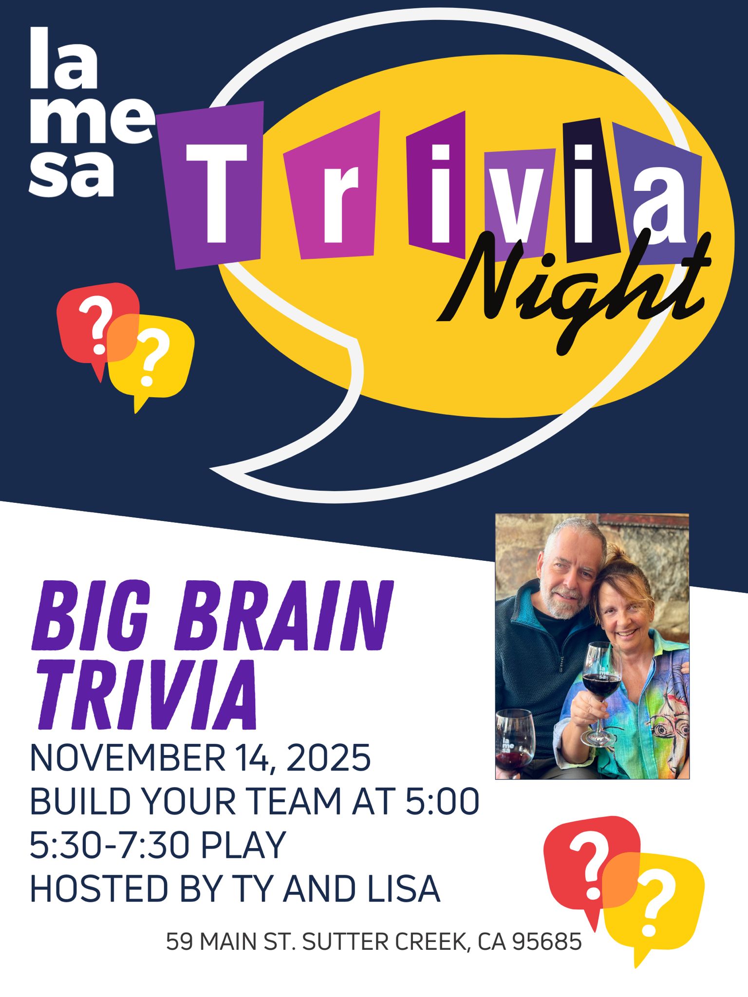 Join us at La Mesa Sutter Creek, 59 Main Street in downtown Sutter Creek for our first Big Brain Trivia Night!