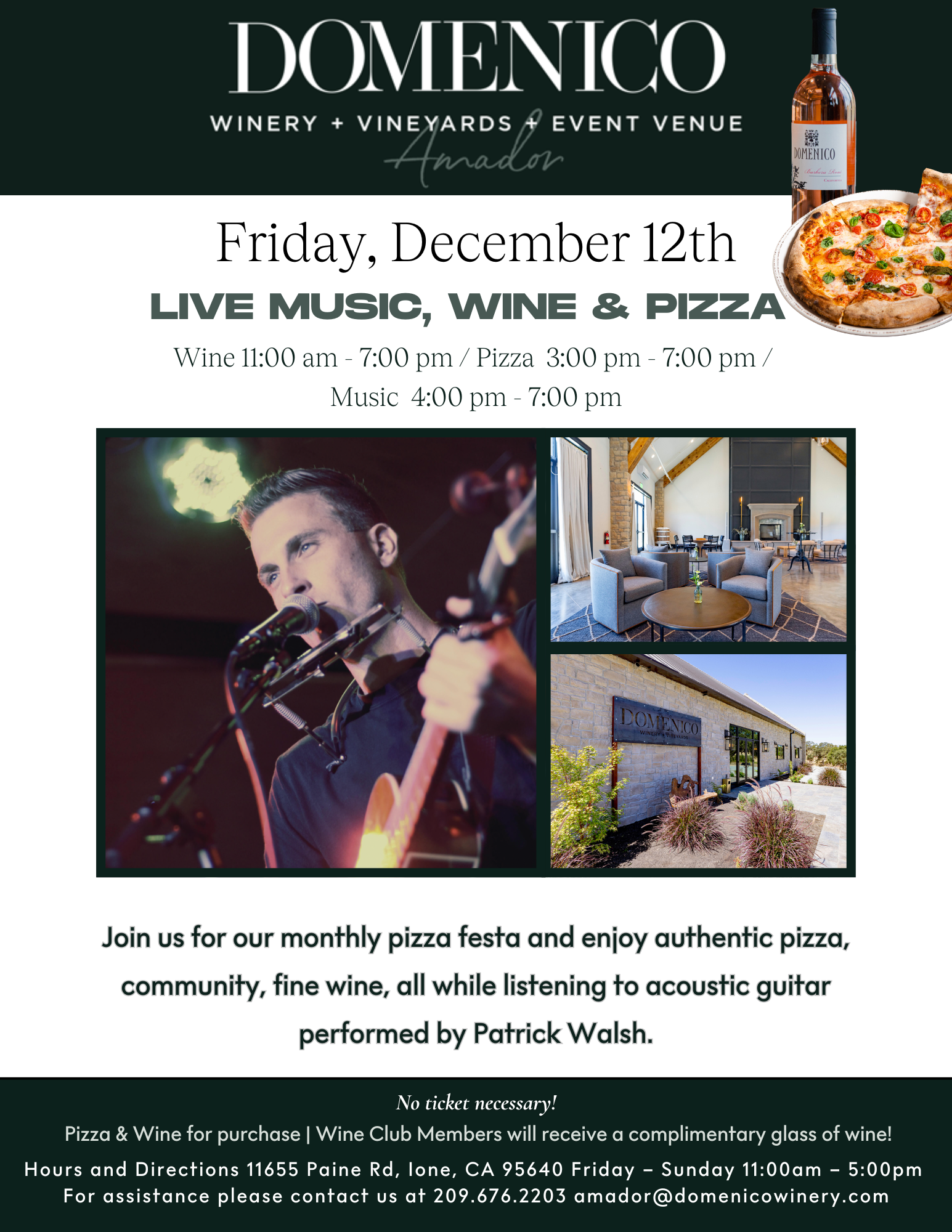 Domenico Winery & Vineyard 11655 Paine Rd., Ione, CA, United StatesEnjoy homemade pizzas in our special artisanal pizza oven handcrafted by Dominick, our owner & winemaker…and sip delicious fine wine, while listening to acoustic guitar artist Patrick Walsh.
