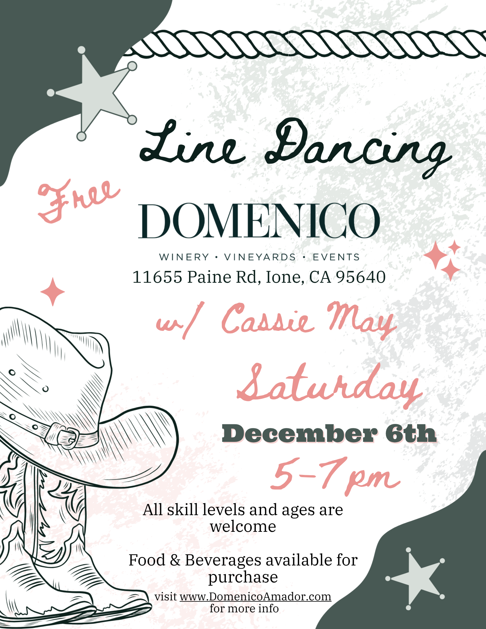 Domenico Winery & Vineyard 11655 Paine Rd., Ione, CA, United StatesGrab your boots and buddies and join miss Cassie May for a fun evening of beginner and pro line dancing. Show up at 5 for an hour of slower paced tutorials, followed by a quicker paced session. Fun for all ages and abilities. Rain or shine! Free to attend for all ages. No outside Food or Beverages.