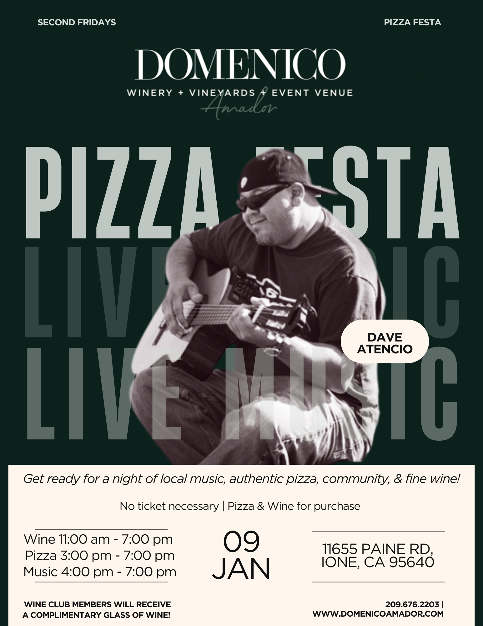 Domenico Winery & Vineyard 11655 Paine Rd., Ione, CA, United StatesPizza Festa | Live Music with Dave Atencio Join us for our Pizza & Music Festa Enjoy homemade pizzas in our special artisanal pizza oven handcrafted by Dominick, our owner & winemaker…and sip delicious fine wine, while listening to the sounds of Dave Atencio. Singer-songwriter known for his versitile, family-style music blending genres like country, reggae, and Spanish guitar. Join us every 2nd Friday of the month! Pizza 3:00 – 7:00 pm | Music 4:00 – 7:00 pm Free Admission | Food, Wine, Beer & N/A Available for Purchase