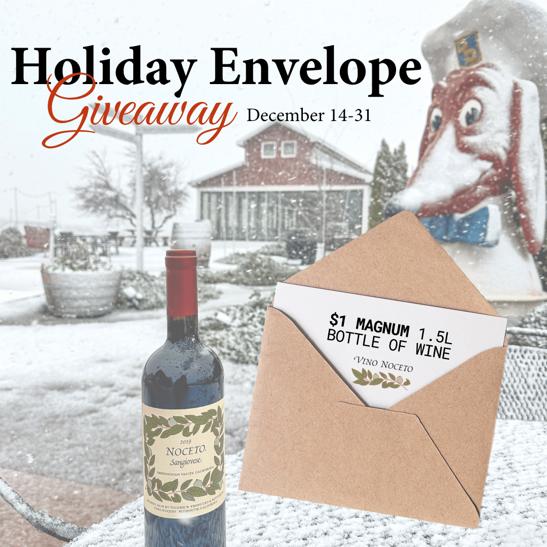 Vino Noceto 11011 Shenandoah Road, Plymouth, CA, United StatesCome celebrate all the December holidays at Noceto. Starting on Sunday, December 14, all Tasting Room purchases greater than $100 will come with a secret surprise envelope gift, with prizes ranging from discounts to free tours to $1 bottles of wine. Bring your envelope back in January 2026 to unveil and claim your prize!