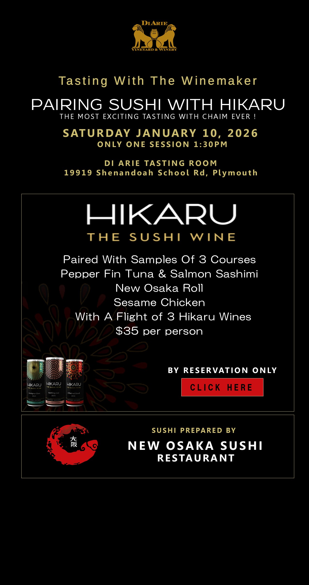 Di Arie Vineyard & Winery 19919 Shenandoah School Rd, Plymouth, CA, United StatesPAIRING SUSHI WITH HIKARU THE MOST EXCITING TASTING WITH CHAIM EVER !