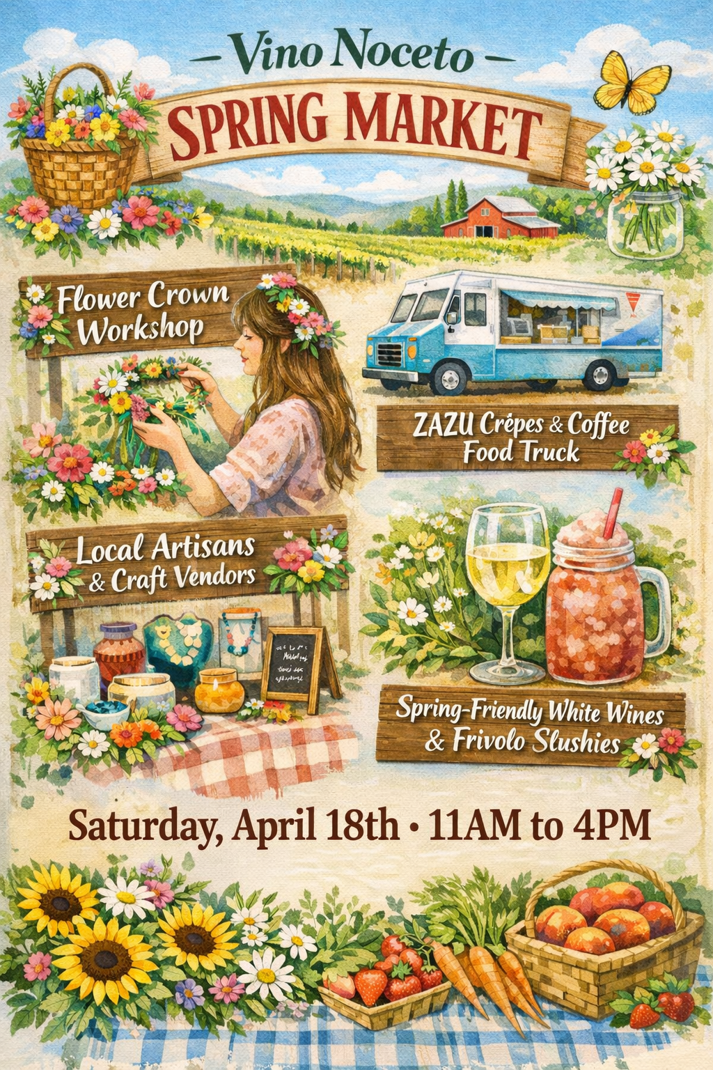 Vino Noceto 11011 Shenandoah Road, Plymouth, CA, United StatesJoin us for our Spring Faire & Market on Saturday, April 18th. Make your own fresh flower crown with our resident flower expert, Jago Landgraf, or order a premade crown to wear as you sip and shop your way through our artisan market! The Flower Crown class is $20 per person, or, if you’d rather skip straight to wearing yours, you can pre-order a fully made flower crown for $25. Classes are limited to 12 people per time slot, with a cut-off date of Thursday, April 16th.