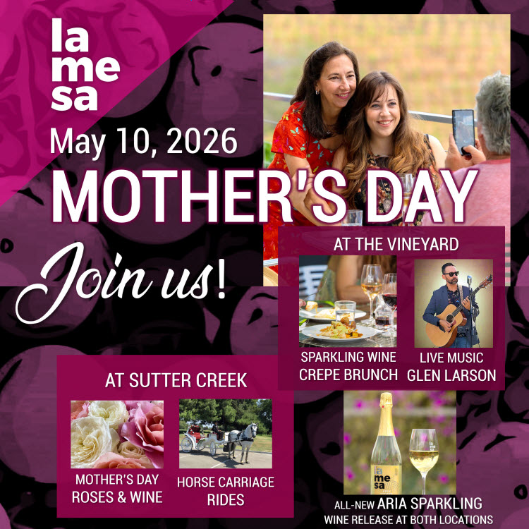 La Mesa Vineyards 13200 Shenandoah Road, Plymouth, CA, United StatesOn Sunday, May 10, treat your mothers (and mothers-to-be) to one of two special experiences: At the La Mesa Vineyard tasting room, La Mesa club members enjoy a special Savory or Sweet crepe brunch prepared by our very own tasting room manager and chef Christine, paired with a glass of newly released Aria Sparkling wine. Musical talent Glen Larson will be playing his acoustic style on the terrace from 12-4pm (terrace will be open to the public after 2pm). At La Mesa Sutter Creek, we will be handing out flowers for Mom's with a wine tasting. Moms taste for free.