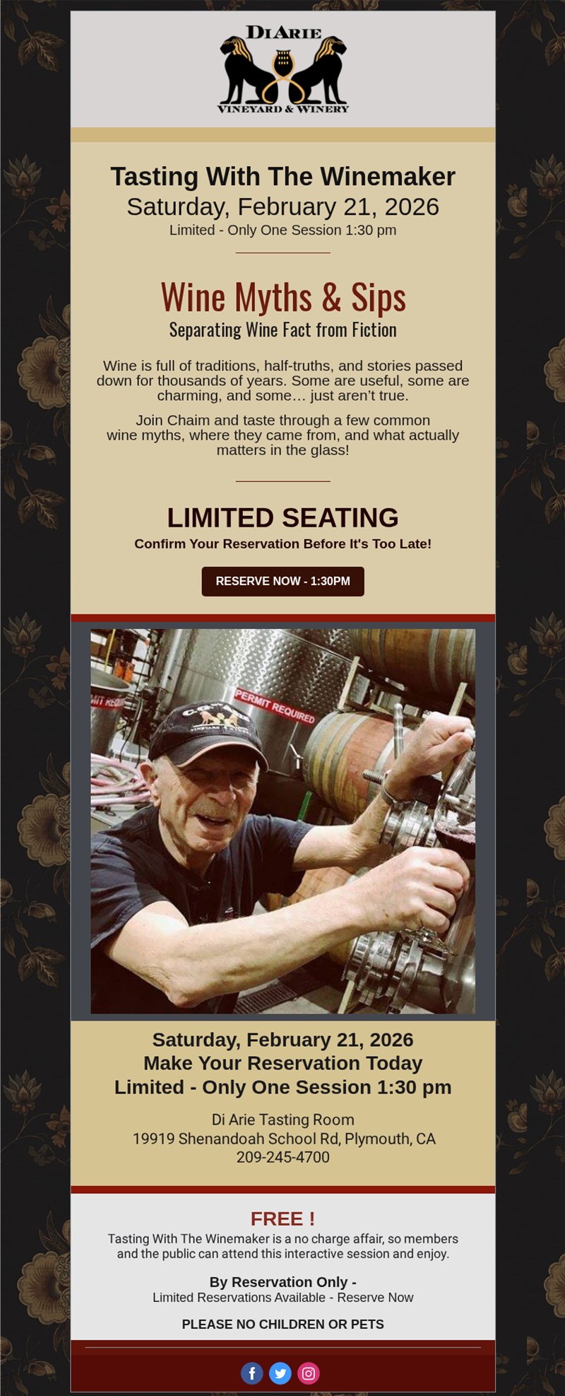 Tasting With The Winemaker Saturday, February 21, 2026 Limited - Only One Session 1:30 pm