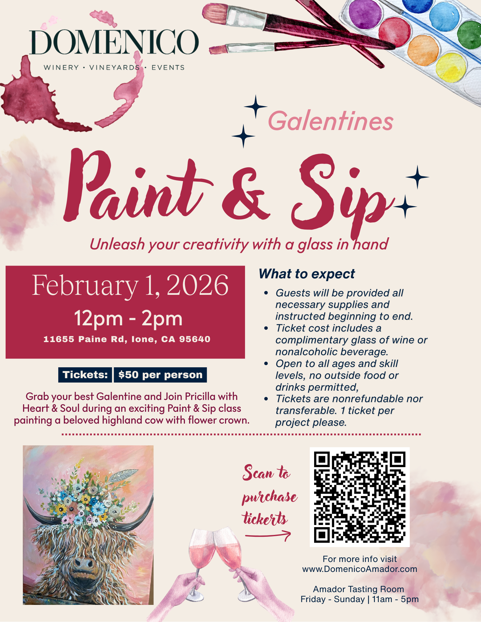 Domenico Winery & Vineyard 11655 Paine Rd., Ione, CA, United StatesGalentines Paint & Sip Unleash your creativity with a glass in hand! Grab your best Galentine and Join Pricilla with Heart & Soul during an exciting Paint & Sip class painting a beloved highland cow with flower crown. Guests will be provided all necessary supplies and instructed beginning to end. Ticket cost includes a complimentary glass of wine or nonalcoholic beverage. Open to all ages and skill levels, no outside food or drinks permitted. Tickets are nonrefundable nor transferable. 1 ticket per project please. $50 per person Reserve Your Canvas 🎨