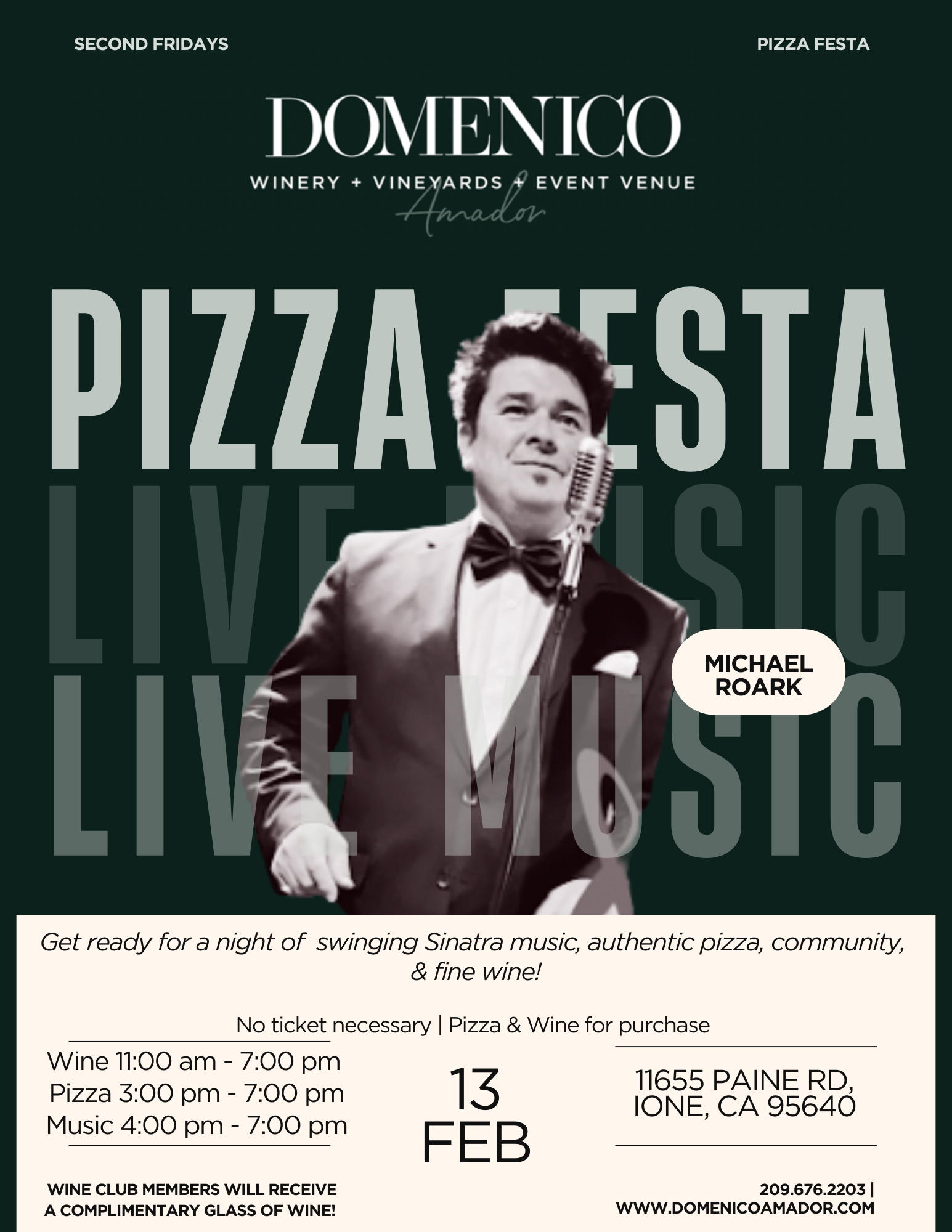 Domenico Winery & Vineyard 11655 Paine Rd., Ione, CA, United StatesPizza Festa | Live Music with Michael Roark Join us for our Pizza & Music Festa Enjoy homemade pizzas in our special artisanal pizza oven handcrafted by Dominick, our owner & winemaker…and sip delicious fine wine, while listening to the sounds of Michael Roark. Join us every 2nd Friday of the month! Pizza 3:00 – 7:00 pm | Music 4:00 – 7:00 pm Free Admission | Food, Wine, Beer & N/A Available for Purchase