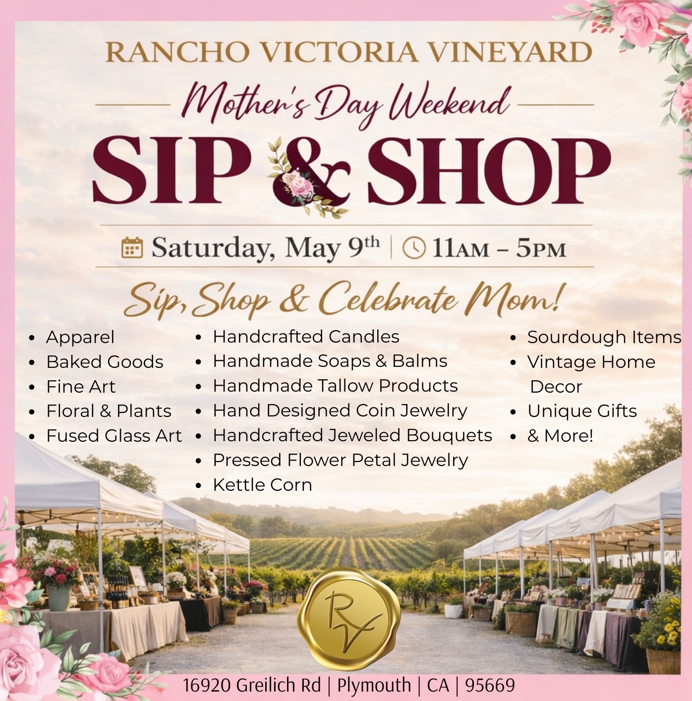 Rancho Victoria 16920 Greilich Rd, Plymouth, CA, United States💐 Sip & Shop at Rancho Victoria 📅 Saturday, May 9 | ⏰ 11AM–5PM Find the perfect gift for Mom while enjoying wine and vineyard views… shop a curated mix of local vendors, from handmade goods to unique gifts. 🛍️🍷 🍑 $5 peach mango wine slushy with any vendor purchase Wine available by the glass & bottle Bring Mom, bring your friends… and make a day of it.