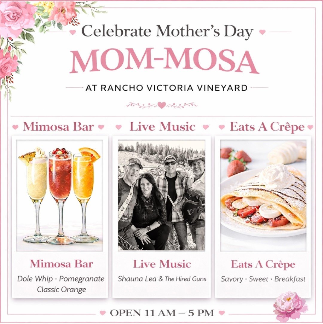 Rancho Victoria 16920 Greilich Rd, Plymouth, CA, United States💐 Mother’s Day at Rancho Victoria Vineyard 📅 11AM–5PM | Free to attend Treat Mom to a relaxing day in the vineyard… enjoy wine, live music, and delicious food with beautiful views. 🍷 🍾 Mimosa Bar (available for purchase) 🎶 Live Music 12–3 PM – Shauna Lea & The Hired Guns 🥞 Eats A Crêpe – sweet & savory crêpes available for purchase Reservations required for tastings… walk-ins welcome for wine by the glass or bottle. Bring Mom, grab a mimosa, and enjoy perfect mild temperatures, live music, and amazing food.